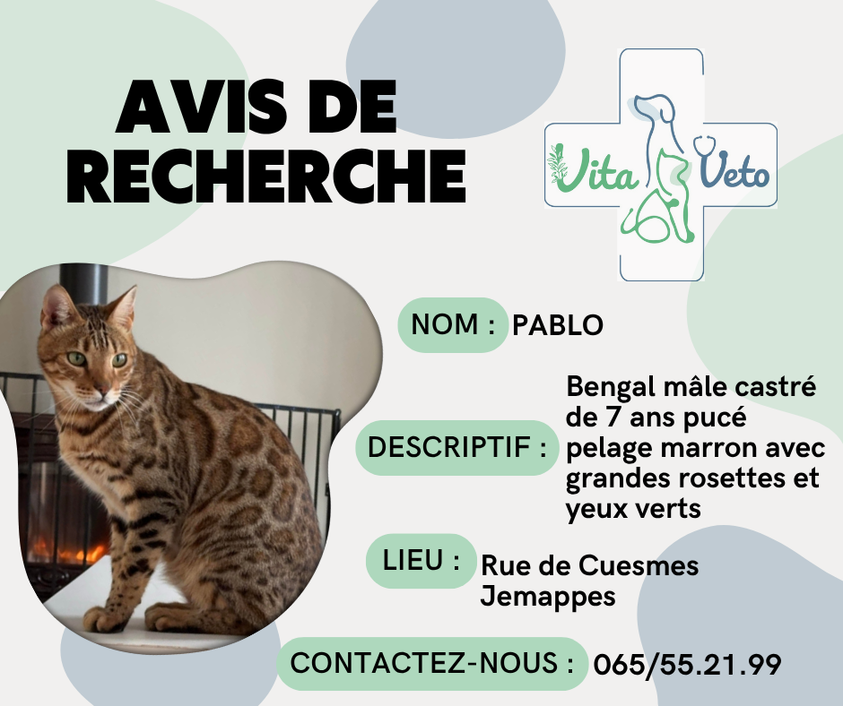 Si vous l’apercevez ou le retrouvez, vous pouvez nous contacter par téléphone au 065/55.21.99 ou via notre mail info@vitaveto.be.